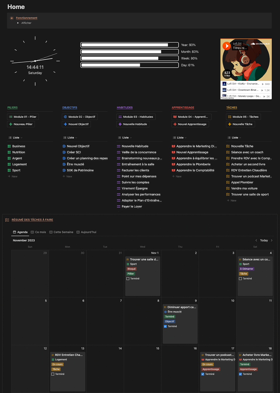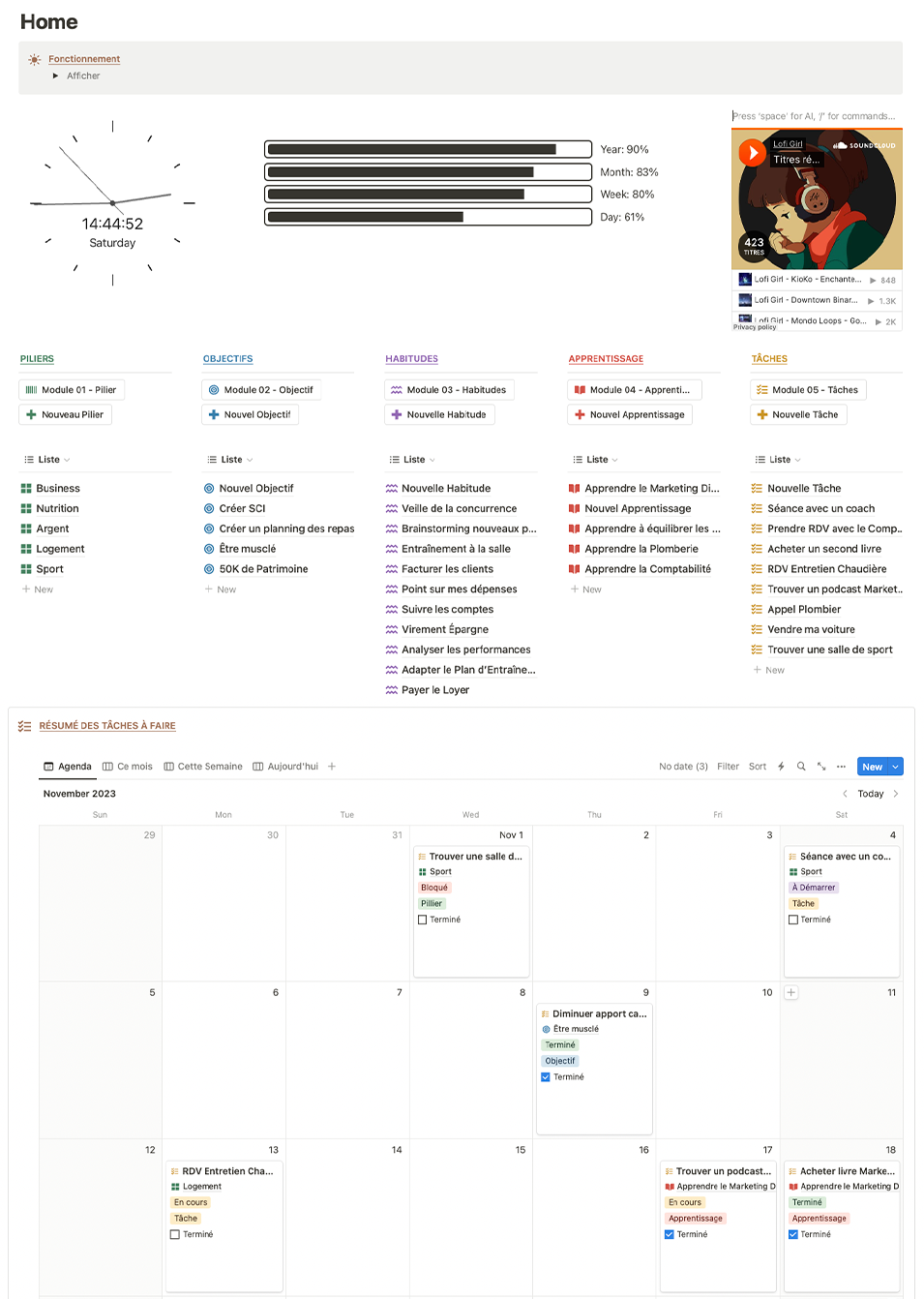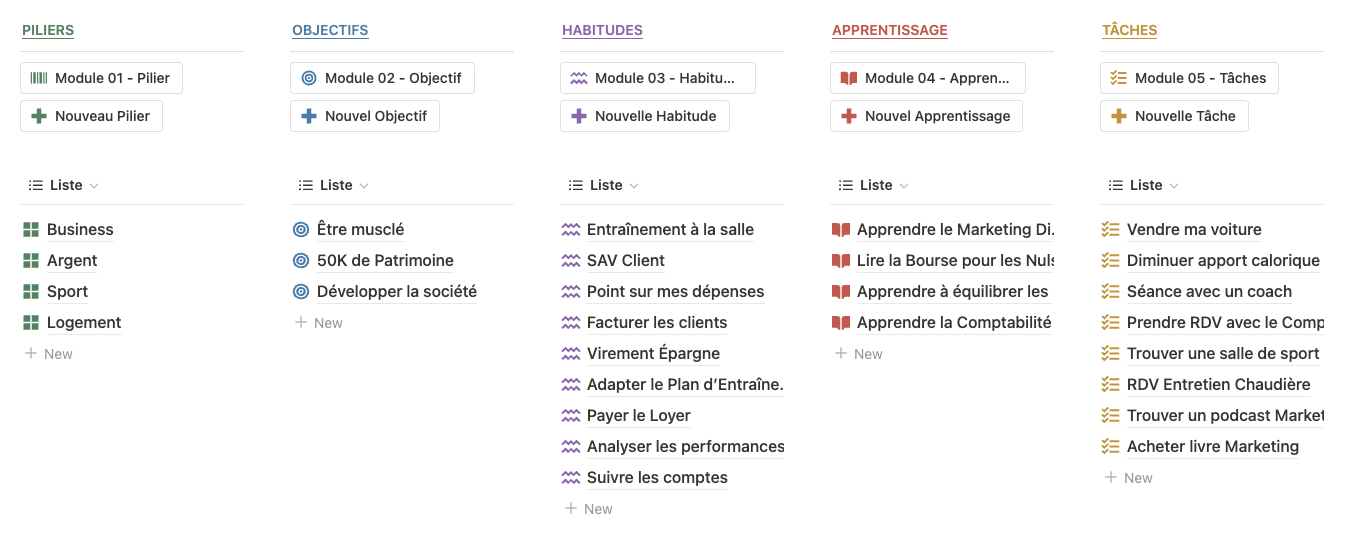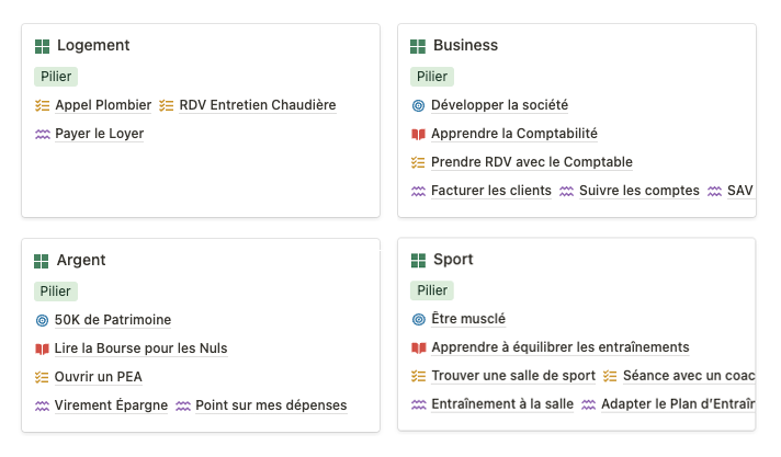 Vous pouvez réunir tous les domaines du développement personnel au même endroit. Le must ? Pour chaque catégorie vous pouvez assigner des objectifs, des habitudes, des tâches ou encore un apprentissage.