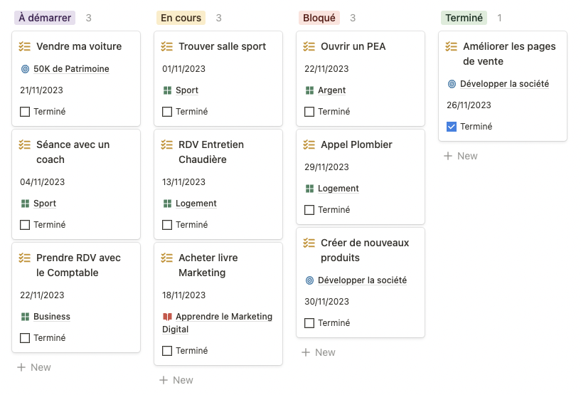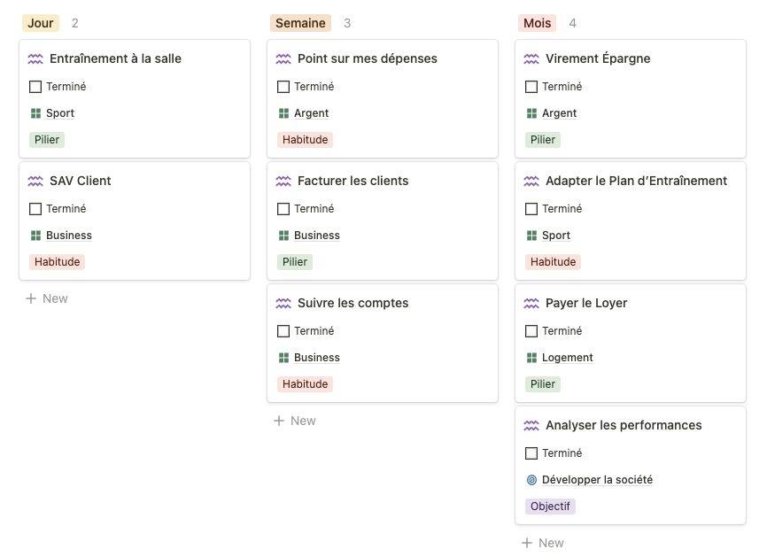 Le tableau de suivi vous permet de savoir dans la seconde où vous en êtes dans vos tâches. Tout est organisé par catégorie de vie.