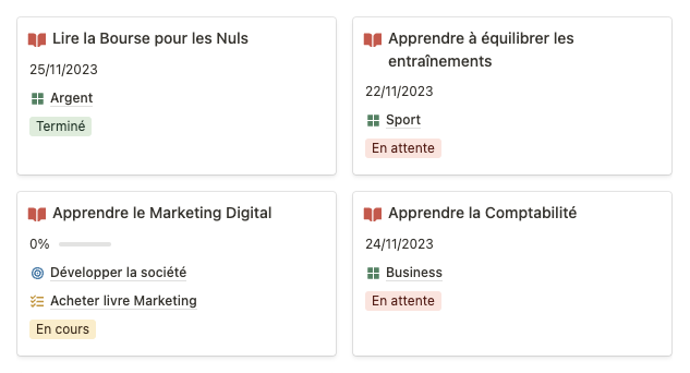 Pour chaque chose que vous souhaitez apprendre, vous pouvez créer une page réunissant vos notes ainsi que les ressources importantes. Vous pouvez également relier un apprentissage avec un objectif !