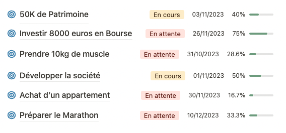 Tous vos objectifs sont regroupés au même endroit afin de faire le point rapidement sur votre progression. Vous pouvez également organiser de manière détaillée chaque objectif afin de créer des listes de tâches et d'apprentissages liés.